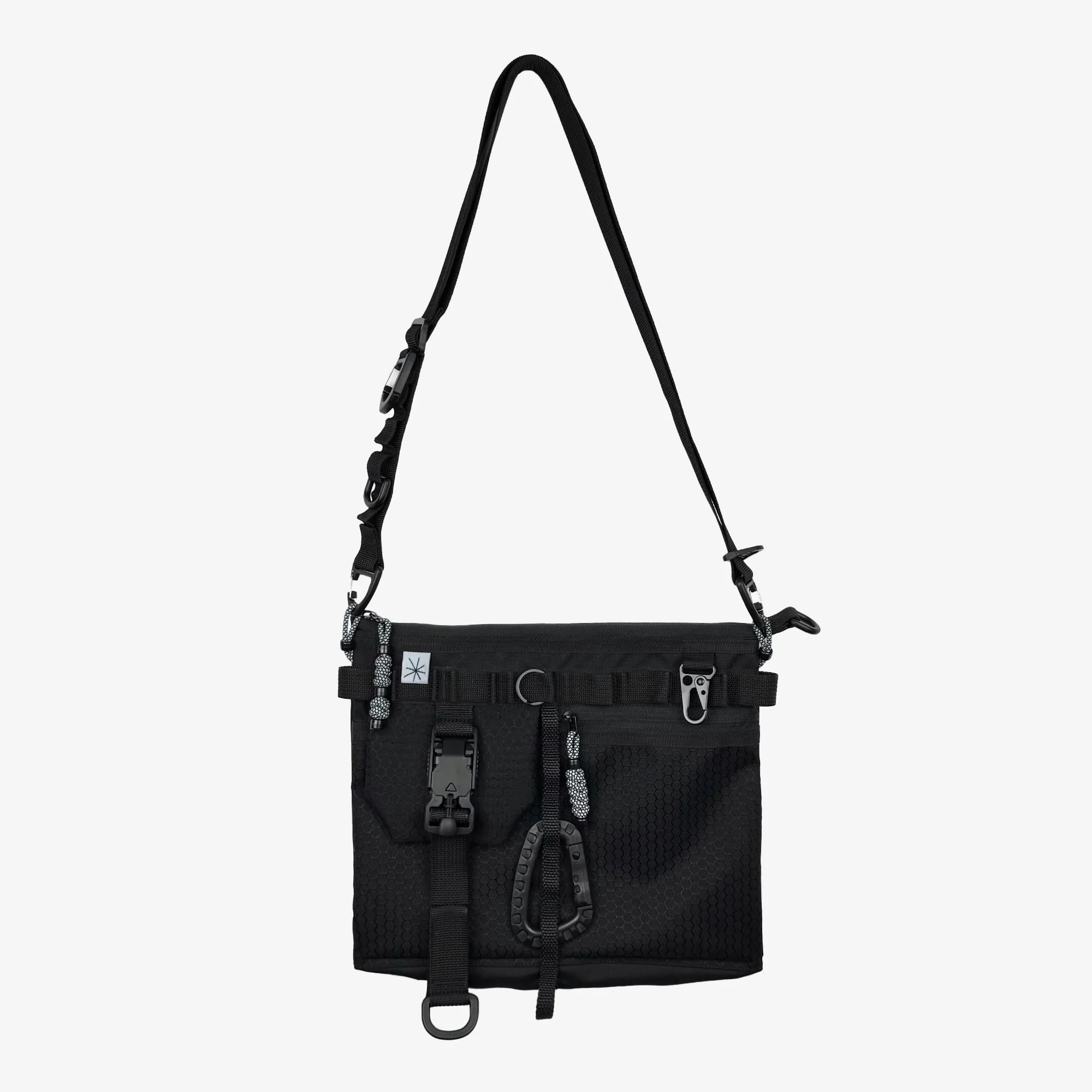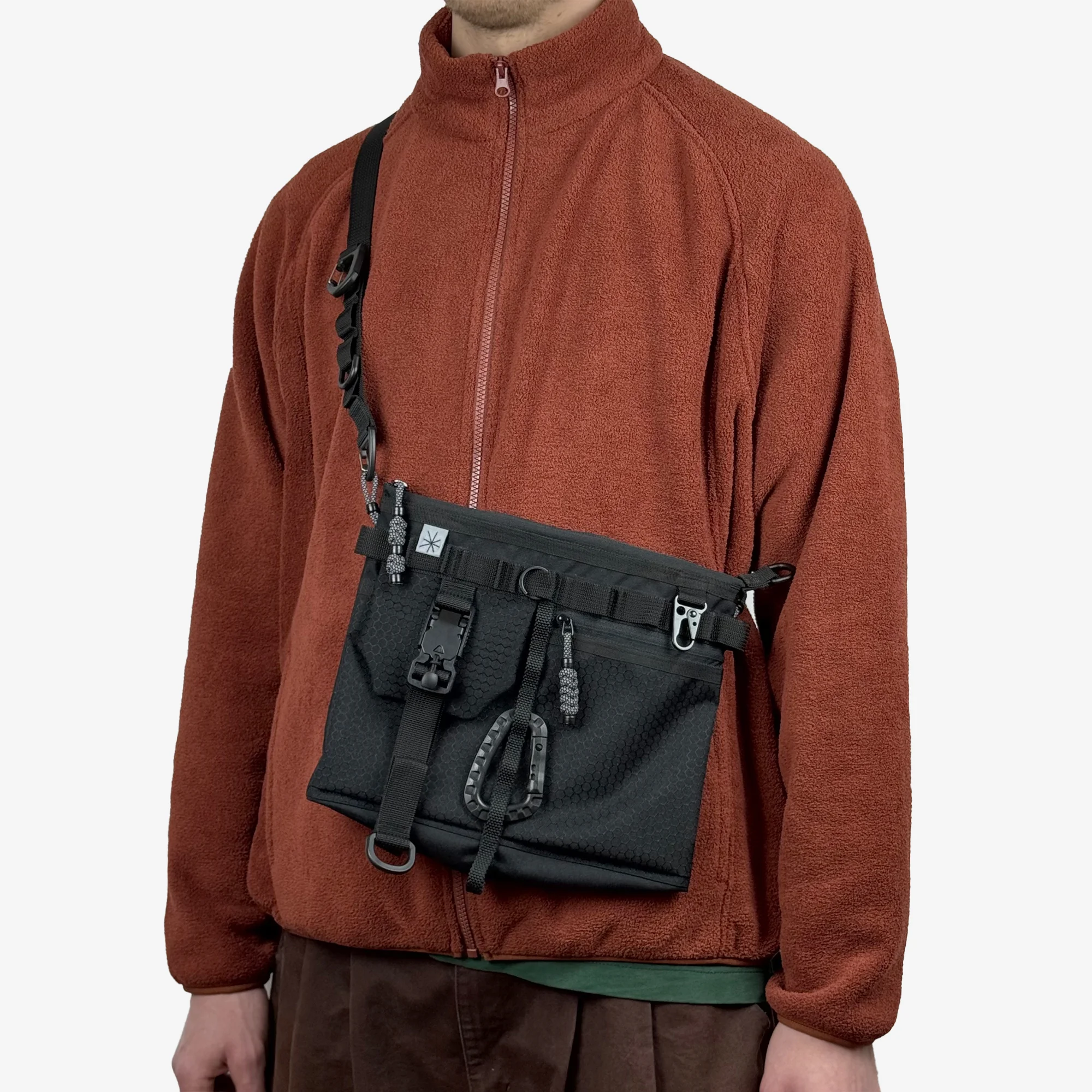 Спереди объемный карман, который делится на два отделения разной ширины, один на молнии, второй закрывается на клапан и фиксируется магнитной пряжкой. В верхней части ряд молле строп для крепления необходимого. Основное отделение на молнии. В комплекте идёт регулирующийся ремешок Размеры сумки: высота - 22см, ширина - 27см, глубина по дну - 2см Вход по молнии 27см